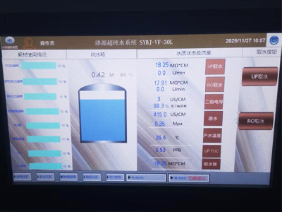 該系統(tǒng)配備100L水箱,采用全封閉循環(huán)設(shè)計。智能控制系統(tǒng)實時監(jiān)測電阻率、TOC等關(guān)鍵參數(shù),確保水質(zhì)穩(wěn)定可靠。滲源工程師團隊根據(jù)醫(yī)學(xué)實驗室操作規(guī)范,優(yōu)化了設(shè)備消毒方案,并對檢測人員進行了專業(yè)培訓(xùn)。