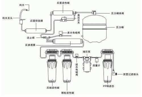 凈水器一般利用自來水管道壓力或自然壓力對水源進行凈化,純水機則需要較高的壓力,約在0.4-0.8MPa。這樣,純水機就需要使用增壓泵,提高反滲透膜的供水壓力。另外,純水機的產(chǎn)水流量都比較小,一般都需要使用儲水裝置,提前制造并儲存一定量的純水,方便用戶使用。