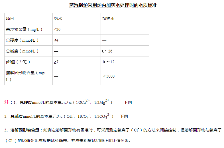 2、額定蒸發(fā)量小于等于2t/h, 且額定蒸汽壓力小于等于1.O MPa 的蒸汽鍋爐和汽水兩用鍋爐 ( 如對(duì)汽、水品質(zhì)無(wú)特殊要求 ) 也可采用鍋內(nèi)加藥處理。但必須對(duì)鍋爐結(jié)垢、腐蝕和水質(zhì)加強(qiáng)監(jiān)督 , 認(rèn)真做好加藥、排污和清洗工作。