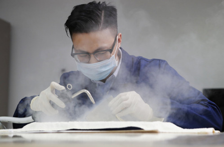 剛出土的文物,都會(huì)被裹上保鮮膜,再送到文物中心,使用純水開(kāi)始基本的清理和修復(fù)工作。宣紙字畫(huà)也是需要用純水進(jìn)行清洗。使用純水浸泡老化的熟宣紙,可以溶解掉宣紙加工過(guò)程中的膠礬劑帶來(lái)酸性物質(zhì),減慢紙的老化速度。